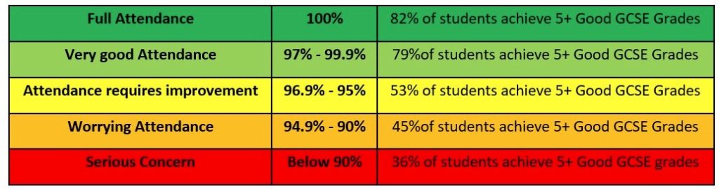 If your child’s attendance does fall below the Government’s target of 95% within this next academic year, it’s likely we’ll include your child in an attendance monitoring and support group and/or initiate attendance action plans in order to support improvements in their attendance. Students with persistent absence, attendance below 93% and/or clear patterns of absence that do not improve through school support will be referred to the Local Authority Education Welfare Service for further intervention.